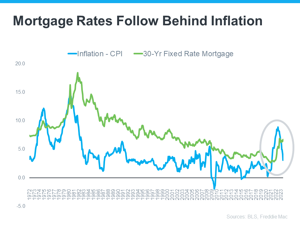 This graph helps illustrate that point by showing that when inflation decreases, mortgage rates typically go down, too (see graph below):